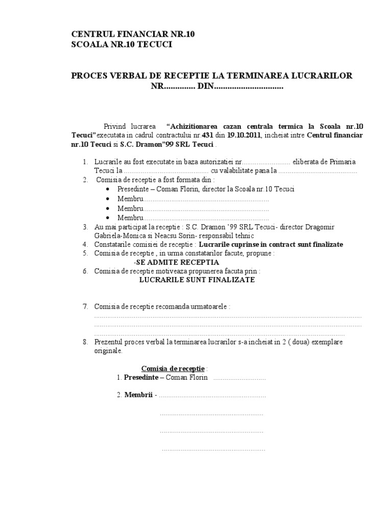 Model Proces Verbal De Receptie La Terminarea Lucrarilor