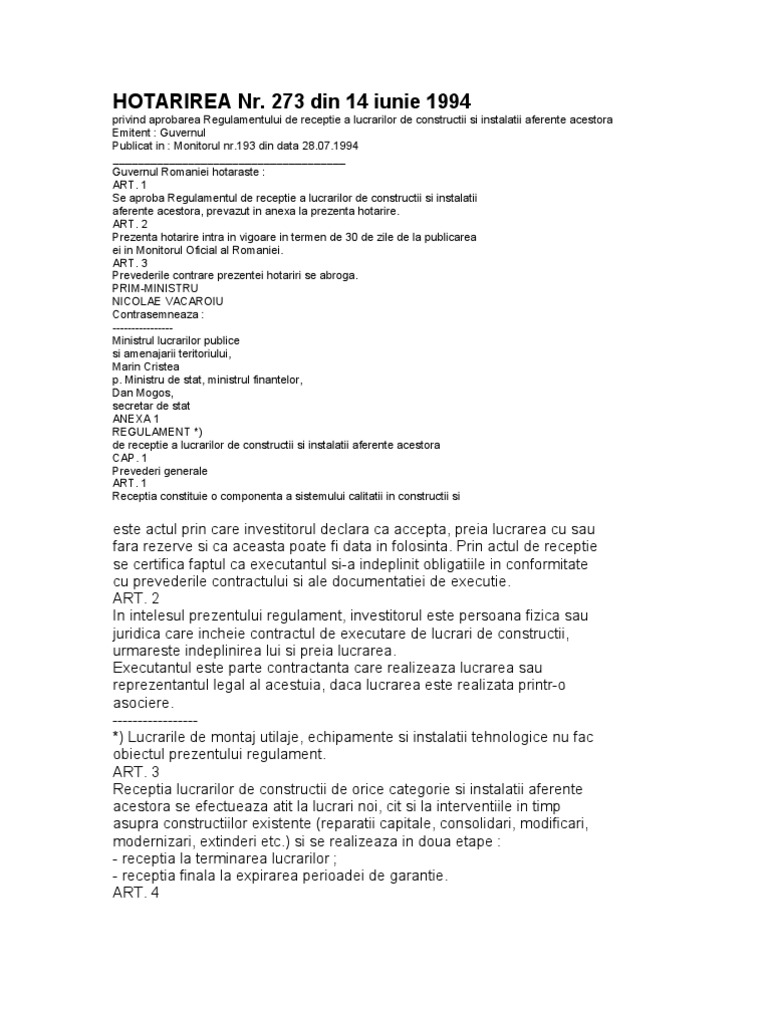 Hg Nr 273 Din 1994 Privind Regulamentul De Receptie Lucrari Constructii