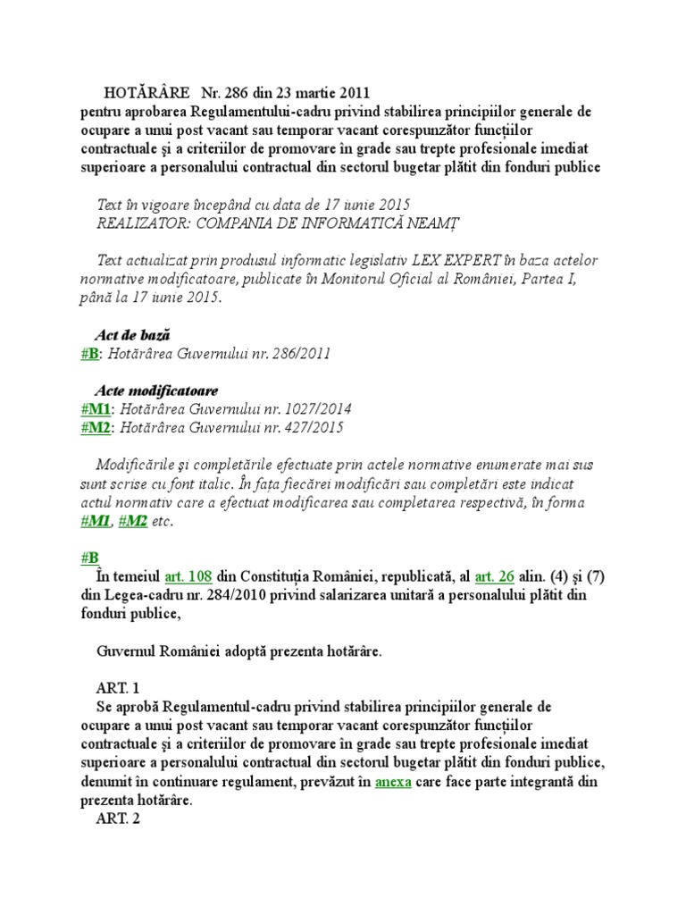 Hg Nr 286 2011 Aprobarea Regulamentului Cadru Privind Stabilirea Principiilor Generale De Ocupare A Unui Post Vacant Sau Temporar Vacant Corespunzator Functiilor Contractuale Din Sectorul Bugetar