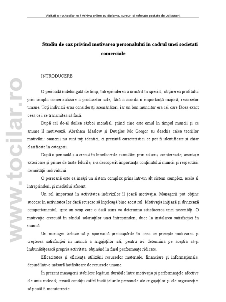 Doc Studiu De Caz Privind Motivarea Personalului In Cadrul Unei Societati Comerciale Ciprian Musca Academia Edu
