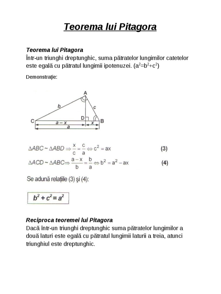 Reciproca teoremei lui pi. Teorema lui pitagora este una dintre cele mai cunoscute teoreme din geometria euclidiană constituind o relație între cele trei laturi ale unui triunghi dreptunghic teorema lui pitagora afirmă că în orice triunghi dreptunghic suma pătratelor catetelor este egală cu pătratul ipotenuzei latura opusă unghiului drept teorema poate fi scrisă sub forma unei relații între cele trei. De ce se pune prima data unghiul la puterea a doua. Un comentariu andreea pe 1 mai 2018 11 42 am.