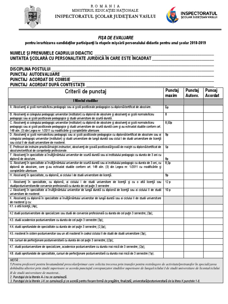 Fisa De Evaluare A Personalului Didactic 2019 Criterii Si Punctaje