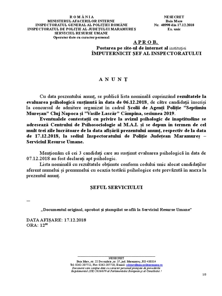 18 12 17 11 11 50anunt Rezultat Testare Psihologica Candidati Concurs De Admitere La Scolile De Agenti De Politie Cluj Napoca Si Campina Sesiunea Ianuarie 2019
