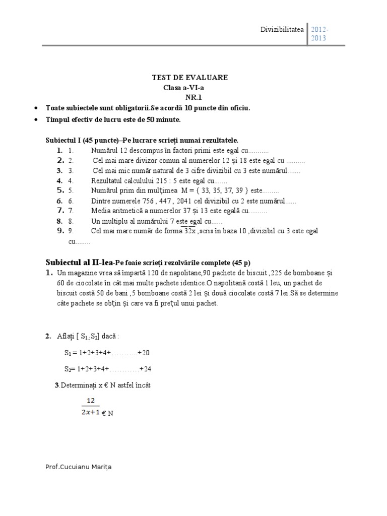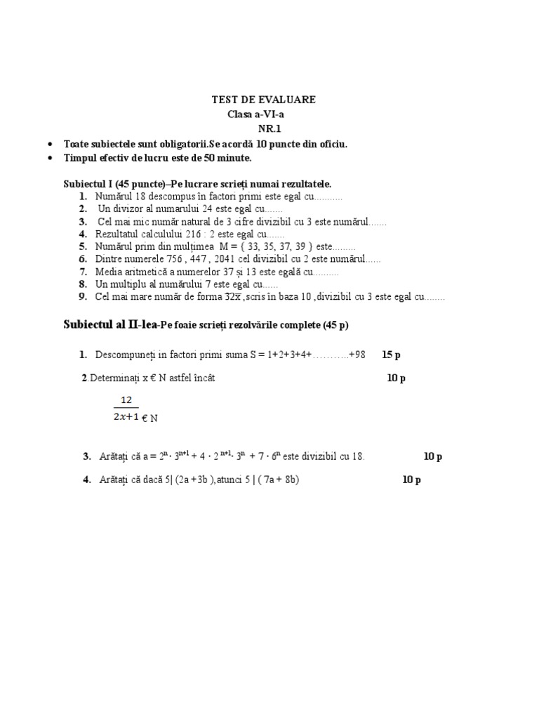 Teste Probleme Exercitii Matematica Clasa A Vi A